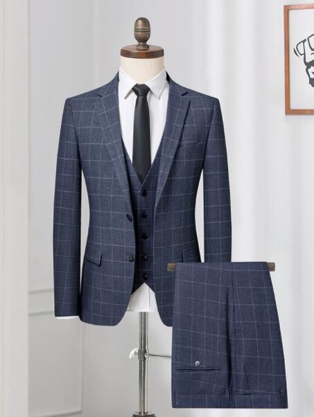 > 人気品高品質L ベスト付きスーツ 3ピーススーツメンズ ウール混セットアップスーツ格子柄 ビジネススーツ ウエスト調節可能 スラックス/紺