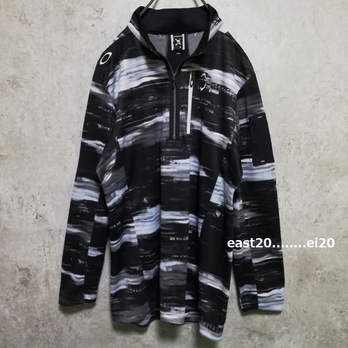 > OAKLEY SKULL オークリー スカル アイコン 刺繍 グラフィック 総柄 ハーフジップ モック ネック 長袖 シャツ L 黒 ブラック 美品 送料無料