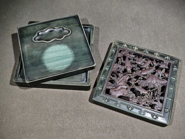 - 蔵出【清時代 松花石彫 鏤空 蓮年有魚 套硯 康熙宸翰款】文房具 書道具 書家用硯 端硯 古硯 骨董品