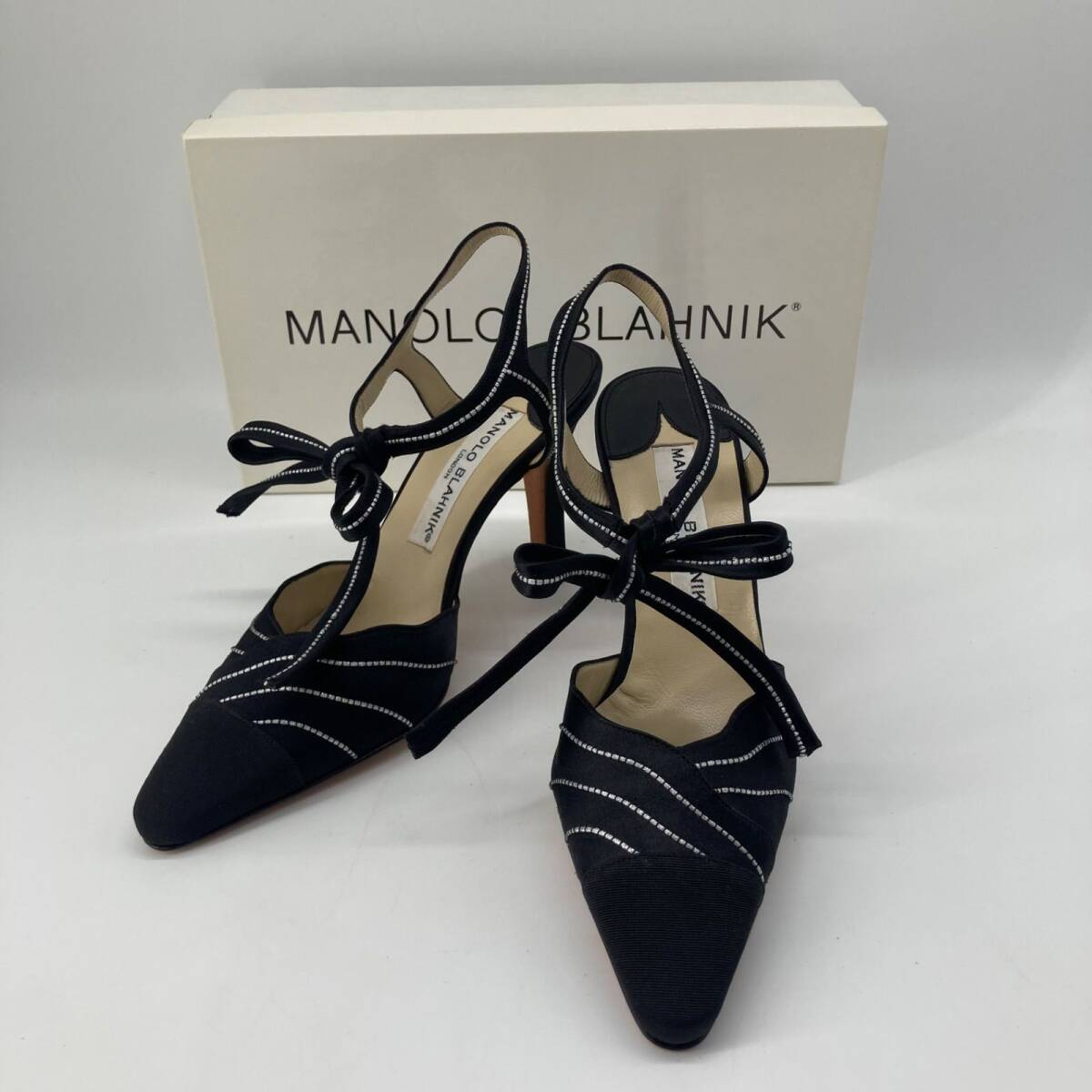 - 13485!!美品◎MANOLO BLAHNIK マノロブラニク パンプス ミュール シルバーライン ストラップ ビジュー 黒 ブラック 36 23cm