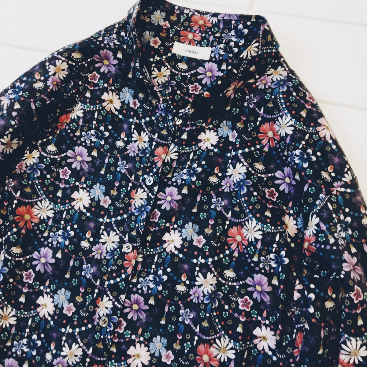 > Parkes×LIBERTY*長袖ブラウス*フローラルガーランド柄*日本製*リバティ*パークス*花柄*小さめ襟*M~Lくらい