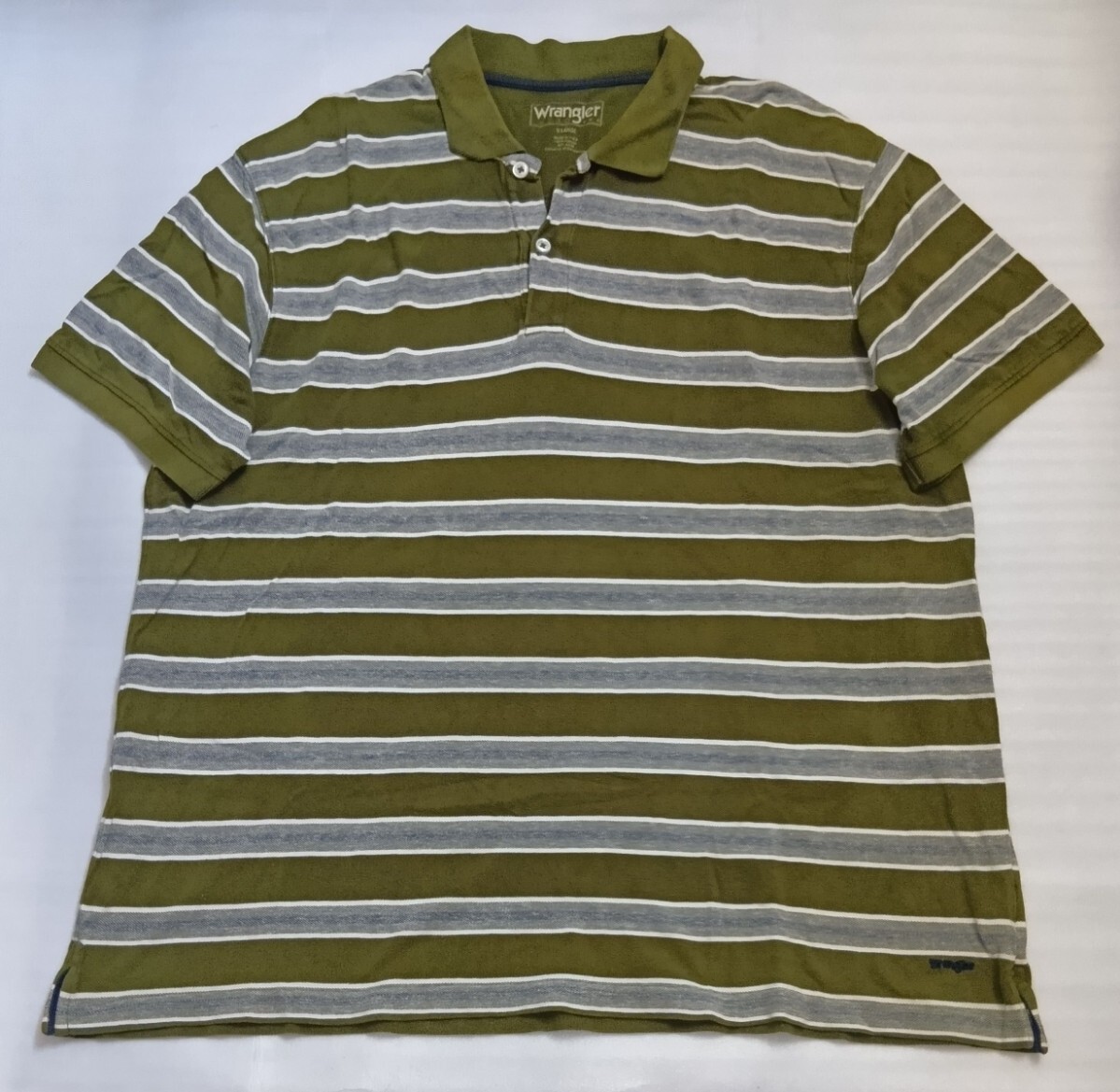 - ☆Wrangler サイズXL ポロ2つボタン半袖シャツ COTTONモス深緑色グリーンしましまスリット刺繍ワンポイント洗濯済 ラングラーJEANSジーンズ