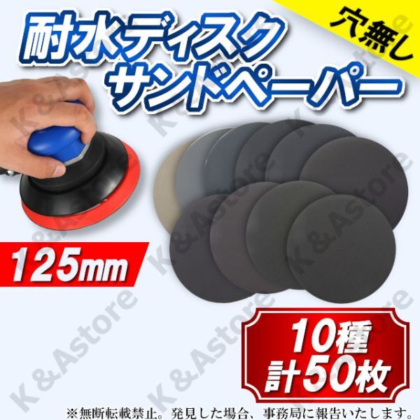 > 耐水 サンドペーパー ディスクペーパー マジックパッド サンダー ポリッシャー 紙やすり ヤスリ 工具 DIY 穴無し 乾湿両用 10種50枚 125mm