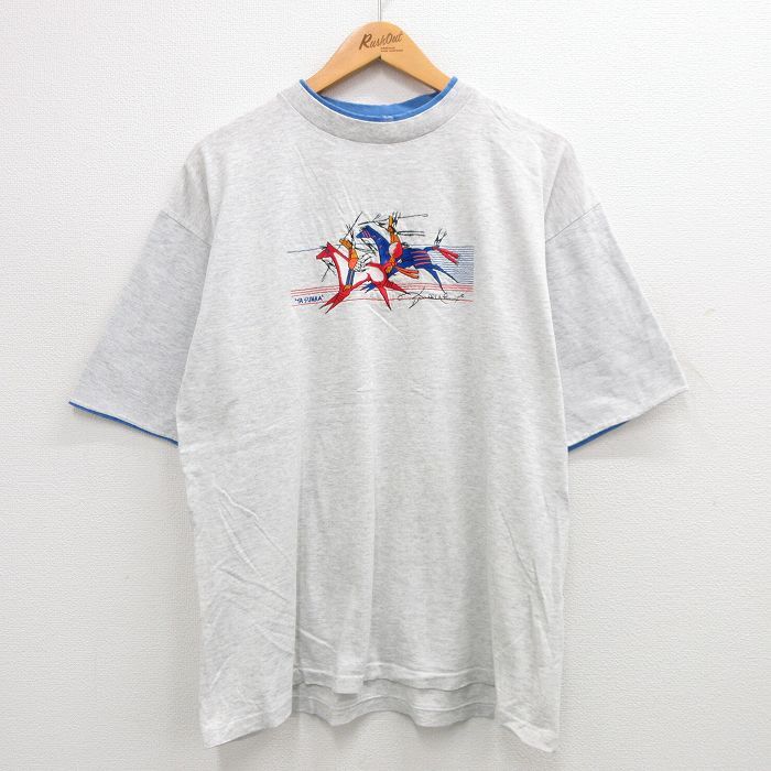 > XL/古着 BELTON 半袖 ビンテージ Tシャツ メンズ 90s 馬 刺繍 大きいサイズ コットン クルーネック 薄グレー 霜降り他 24jun