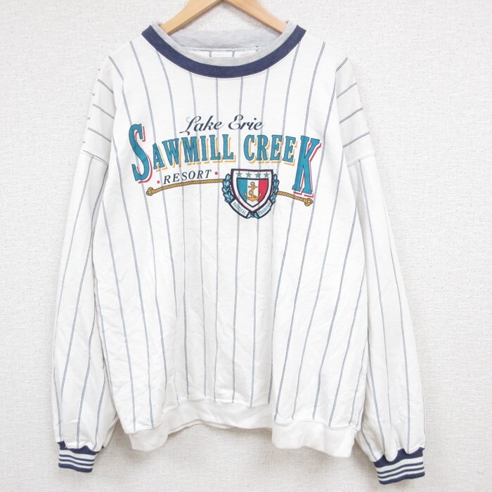 - XL/古着 長袖 スウェット メンズ 90s ソーミルクリークリゾート 大きいサイズ クルーネック 白他 ホワイト ストライプ 23oct
