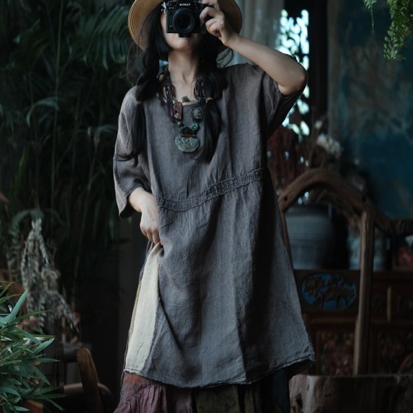 - lgn 0479 ワンピース チュニック アンティーク風 洋服ミックス ロマンファッション ポップ 楽ちん 縫い合わせ 麻100% リネン RINEN