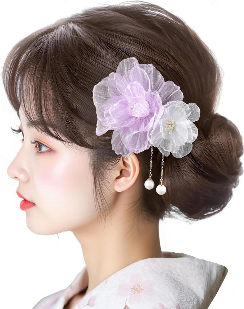 - 髪飾り パール 花 ヘアクリップ 適切な 和風 和装 成人式 結婚式(白&紫)