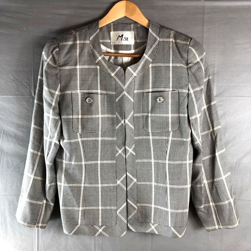 > M.st ジャケット ノーカラー チェック フロントポケット 肩パッド付き 裏地付き ベージュ系 ブラック系 11サイズ 2025082800209