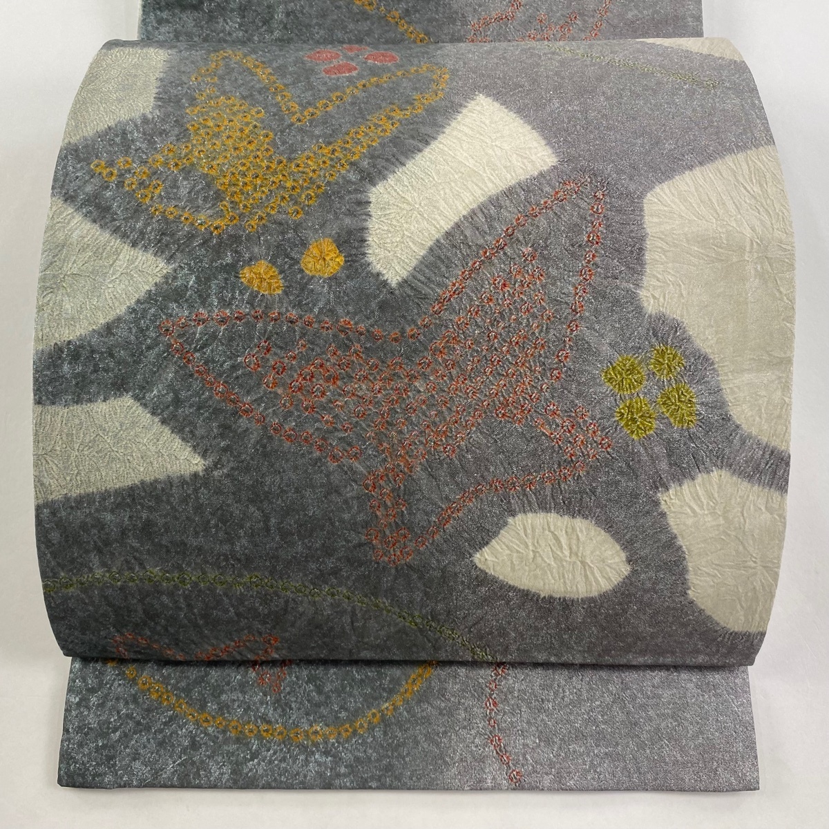 - 袋帯 美品 秀品 蝶 花 銀彩 絞り 灰紫 お太鼓柄 正絹 【中古】