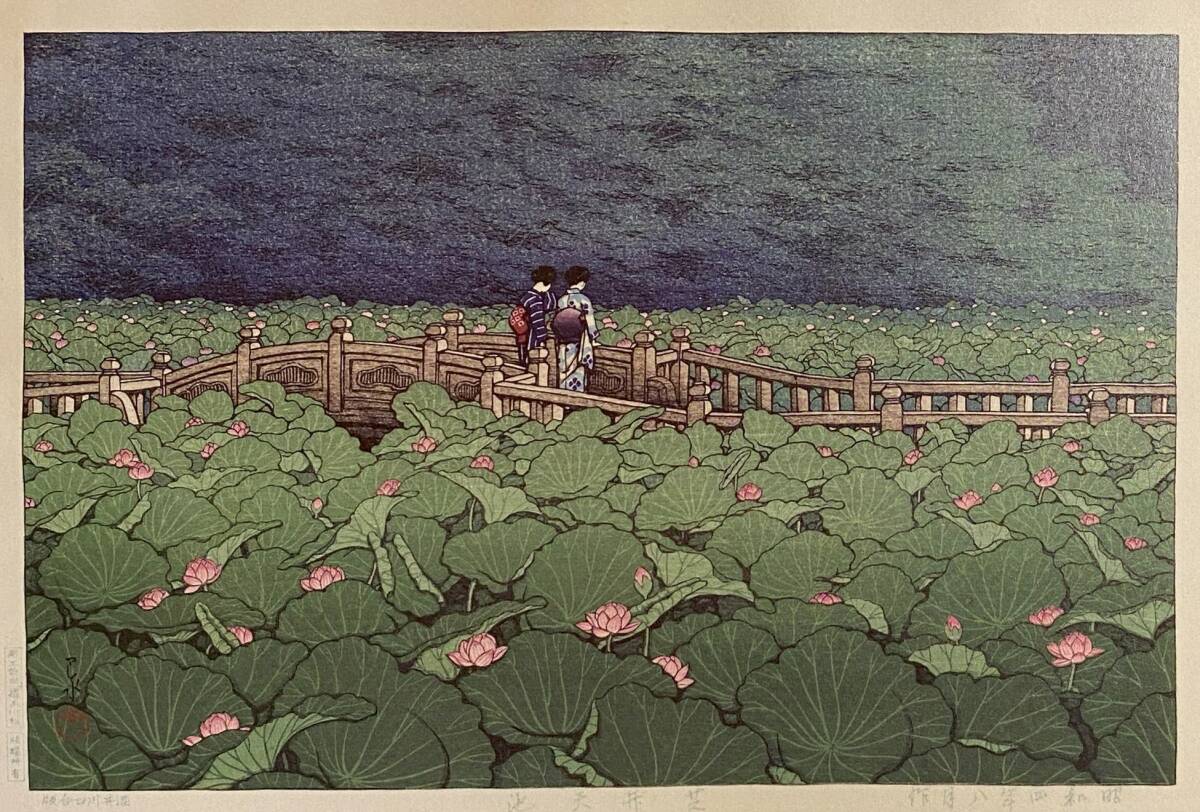 - 川瀬巴水、〈芝弁天池〉、希少画集画、高級新品額・額装付、状態良好、送料込み