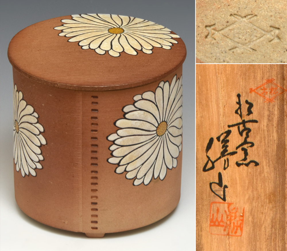 - 松阪萬古 松古窯 佐久間勝山(造)木地曲模 菊置上文 水指 共箱 陶磁器 茶道具 u1019o