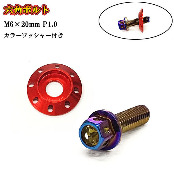 > フランジ付六角ボルト M6 ねじ長さ20mm P1.0 車 バイク おしゃれ カラーワッシャー フジツボ 座面枠付 20mm 焼きチタン×レッド