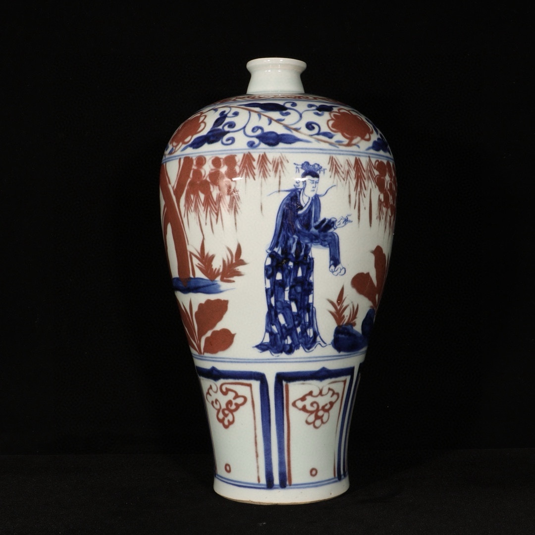 - 元青花 染付 釉里紅 人物故事梅瓶 唐物 箱付き 陶磁器 中国美術 古美術 置物 高さ34cm 直径18cm RG608