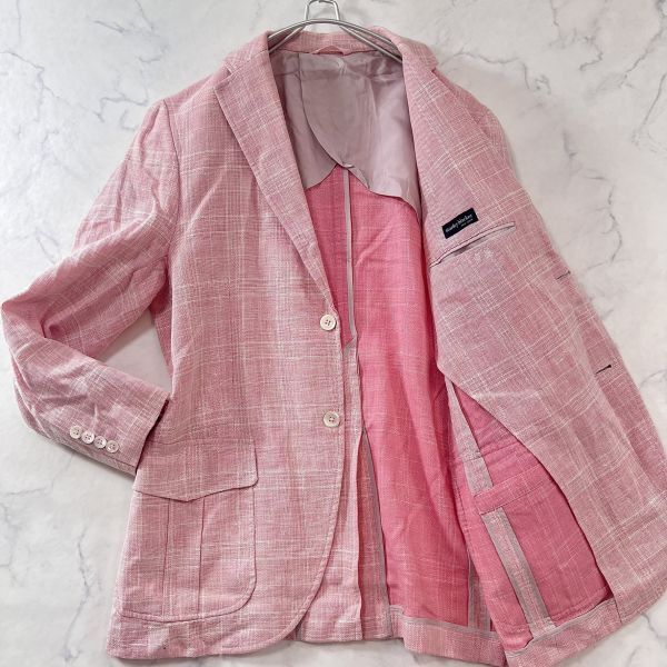 > 【L】極美品 絹麻 三者混 ロロピアーナ テーラードジャケット チェック柄 センターベント パイピング ピンク loro piana B1474 メンズ