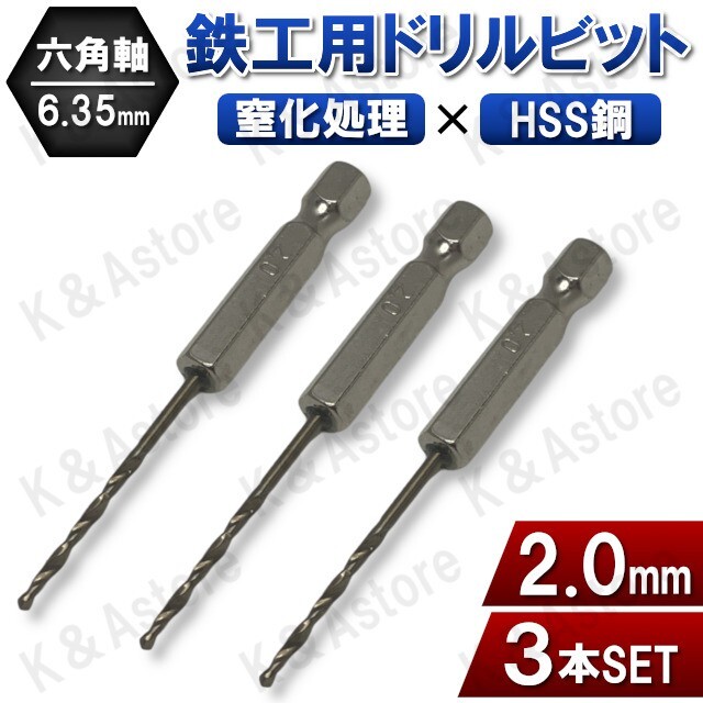 - 六角軸ドリル ビット セット 鉄工用 2mm 2.0mm 3本 ドリル刃 穴あけ 穴開け インパクトドライバー 電動ドリル 金属 木材 工具 ハイス鋼 HSS