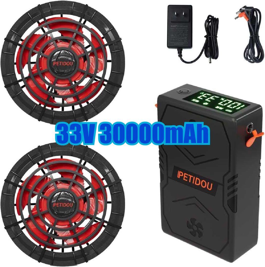 - 【33V超高出力 LED表示パネル】ファンバッテリーセット ファン付き作業服対応 30000mAh大容量バッテリー 最大32時間連続稼働 6段階風量調節