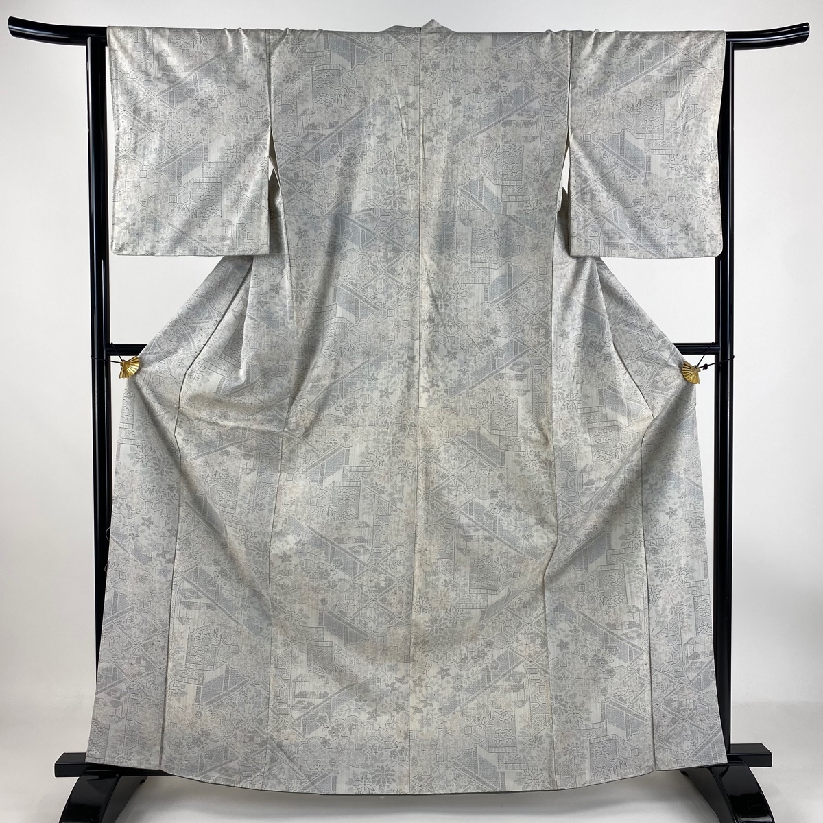> 紬 身丈164cm 裄丈64cm M 袷 証紙 松竹梅 雲文 灰白 正絹 秀品 【中古】