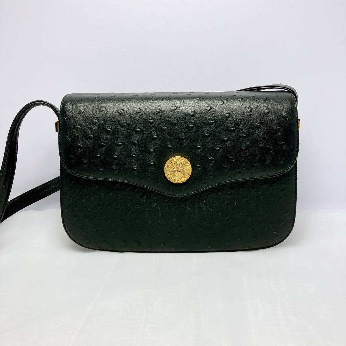 > BG324○ WORLD POLO ワールドポロ オーストリッチ ショルダーバッグ 黒 ブラック ボタン ゴールド 内ポケット ファスナー フォーマル