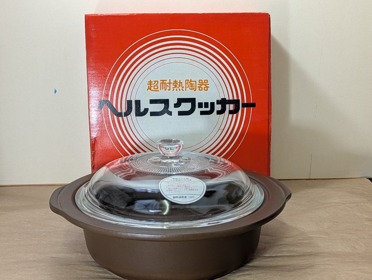 > 伊奈製陶 ヘルスクッカー ガラス蓋付 浅型鍋 未使用箱入 /レトロキッチン/直火対応/両手鍋/超耐熱容器/セラミック鍋/