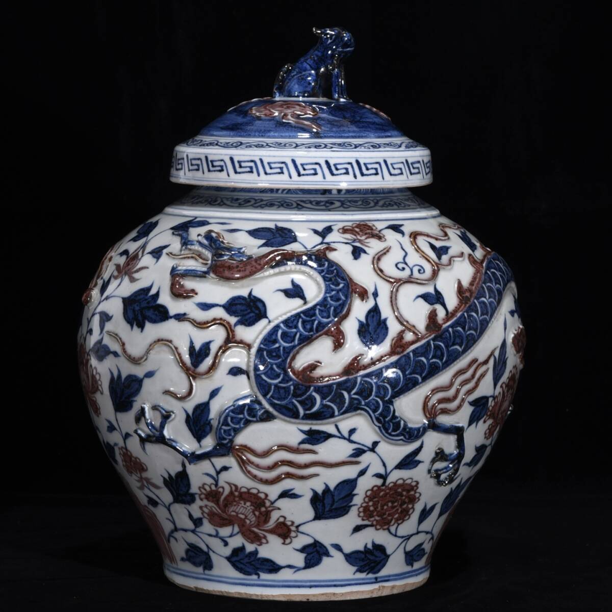 - 磁器 元時代 青花釉里紅堆塑龍紋蓋罐缸 秘蔵 33cm古陶磁器 陶芸 唐物 古賞物 時代物 骨董品 古置物 極細工 中国磁器 古美味 中国古玩921