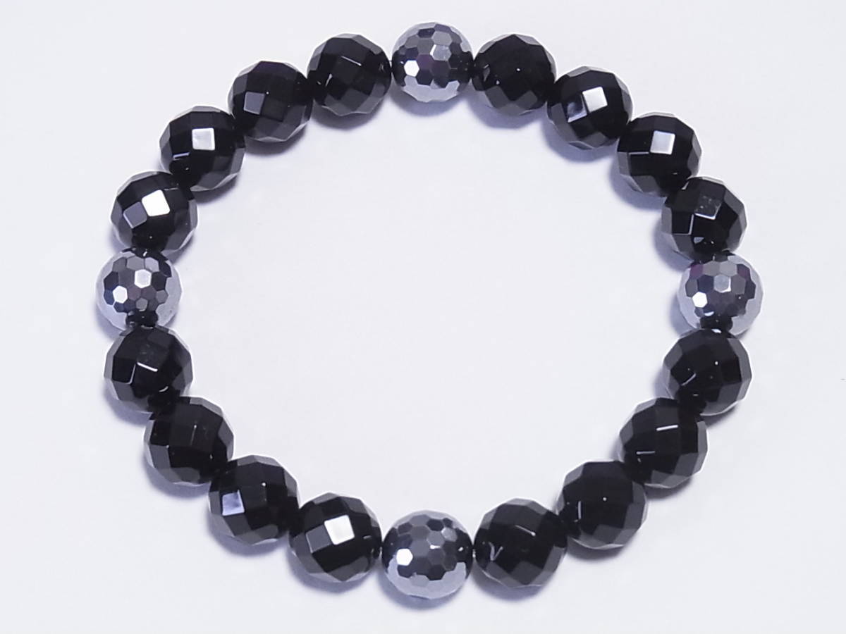- 高純度テラヘルツ/カット×ブラック・オニキス/カット 10mm 内周18㎝ ストレッチ・ブレスレット(伸縮)