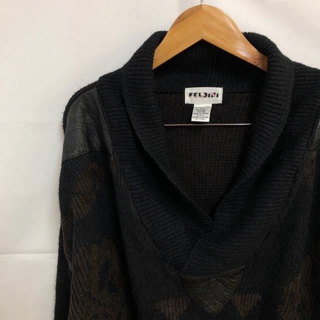 > A776 フェルディニ XL アメリカ古着 レザー切替 アクリル混 ショールカラーセーター ブラック FELDINI メンズ