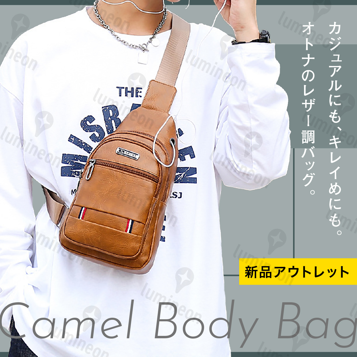 - 新品アウトレット ボディバッグ メンズ コード穴 多機能 撥水 大きめ 茶 レザー カバン ショルダー バッグ キャメル 20代〜50代 g045cA 3