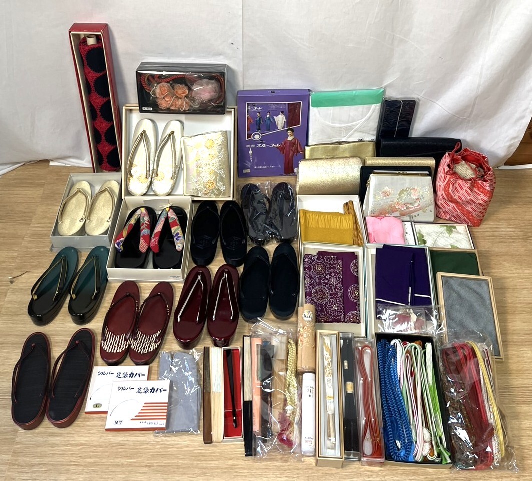 - 【M880】1円スタート/和装小物/まとめ売り/下駄/草履/帯締め/半えり/バッグ/足袋カバー/扇子/ふくさ/髪飾りなど/50点以上/着付け小物