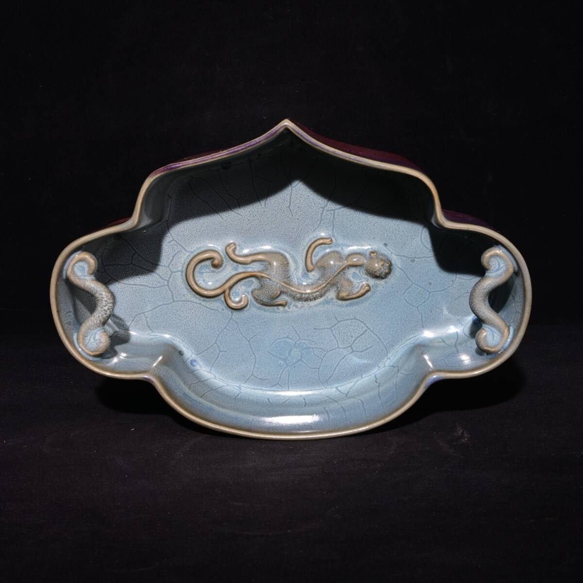 > 9_ZZ9306【惠】人間国宝 中国骨董 陶芸 磁器【宋鈞窯多字款チ竜紋如意海棠洗】工芸品 施釉陶 青花磁 陶芸 置物 收藏品