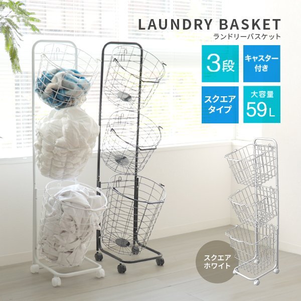 > ランドリーバスケット 3段 大容量59L ワイヤーバスケット 36×37×122cm キャスター付き 省スペース スリム ワゴン 洗濯 脱衣 収納 かご 白