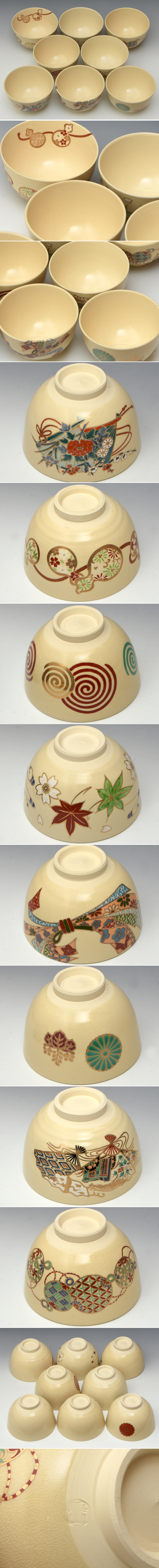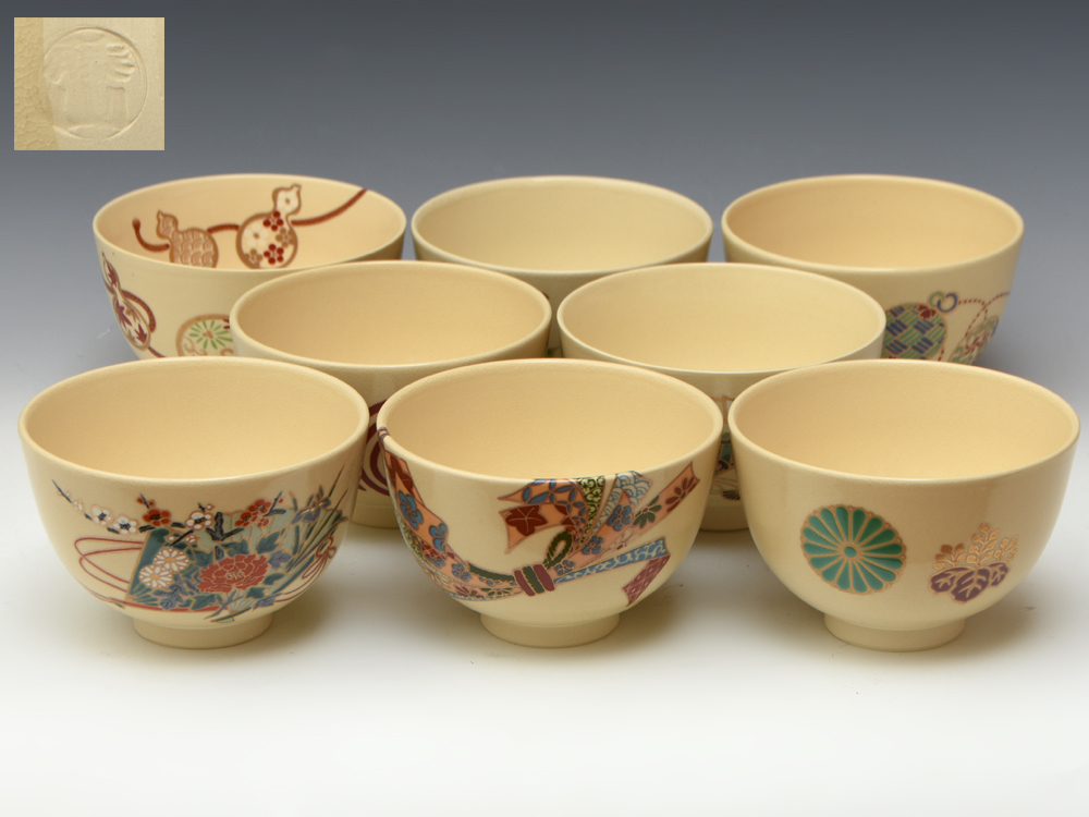 - 美濃 藤山窯 加藤藤山(造)色絵 絵替り数茶碗8客 組茶碗 茶碗 茶道具 陶磁器 未使用 u1064o