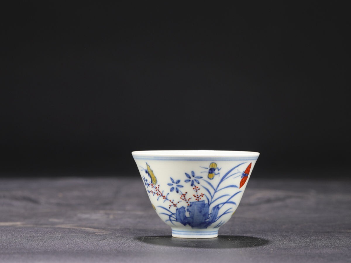 - 「明 成化年製 陶磁器 鬥彩三秋杯」染付 置物 擺件 古賞物 中国古美術 旧蔵出
