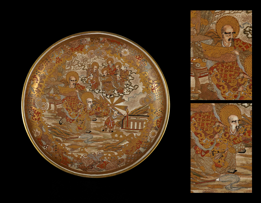 - 【簡】明治期 薩摩焼 色絵 金彩 人物図 大皿 幅42cm 箱付(検: 飾皿 金襴手 古薩摩 薩摩焼 宮川香山級 羅漢 藪明山 細密絵 京薩摩 )