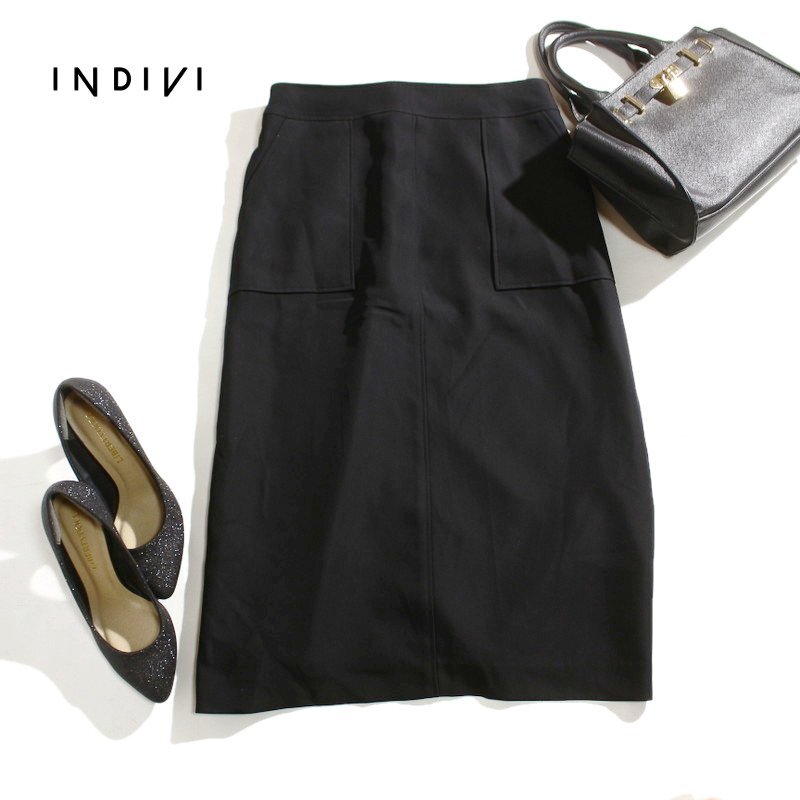 > 美品 インディヴィ INDIVI 株) ワールド 通年 合物 フロントポケット タイトスカート 9号 38 ブラック 黒 スカート オフィス 通勤 スーツ