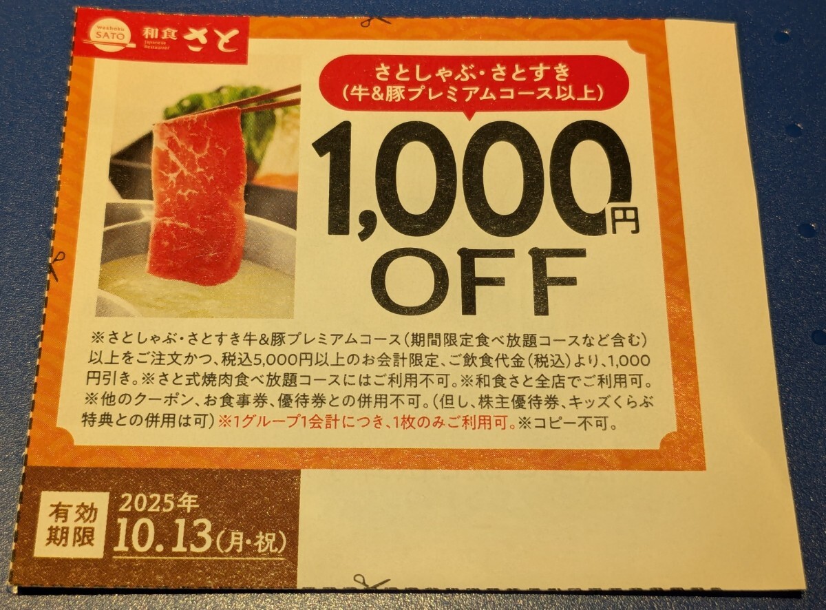 - 和食さと★さとしゃぶ・さとすき牛&豚プレミアムコース以上1,000円割引券★10月13日まで有効★食べ放題★クーポン★優待券