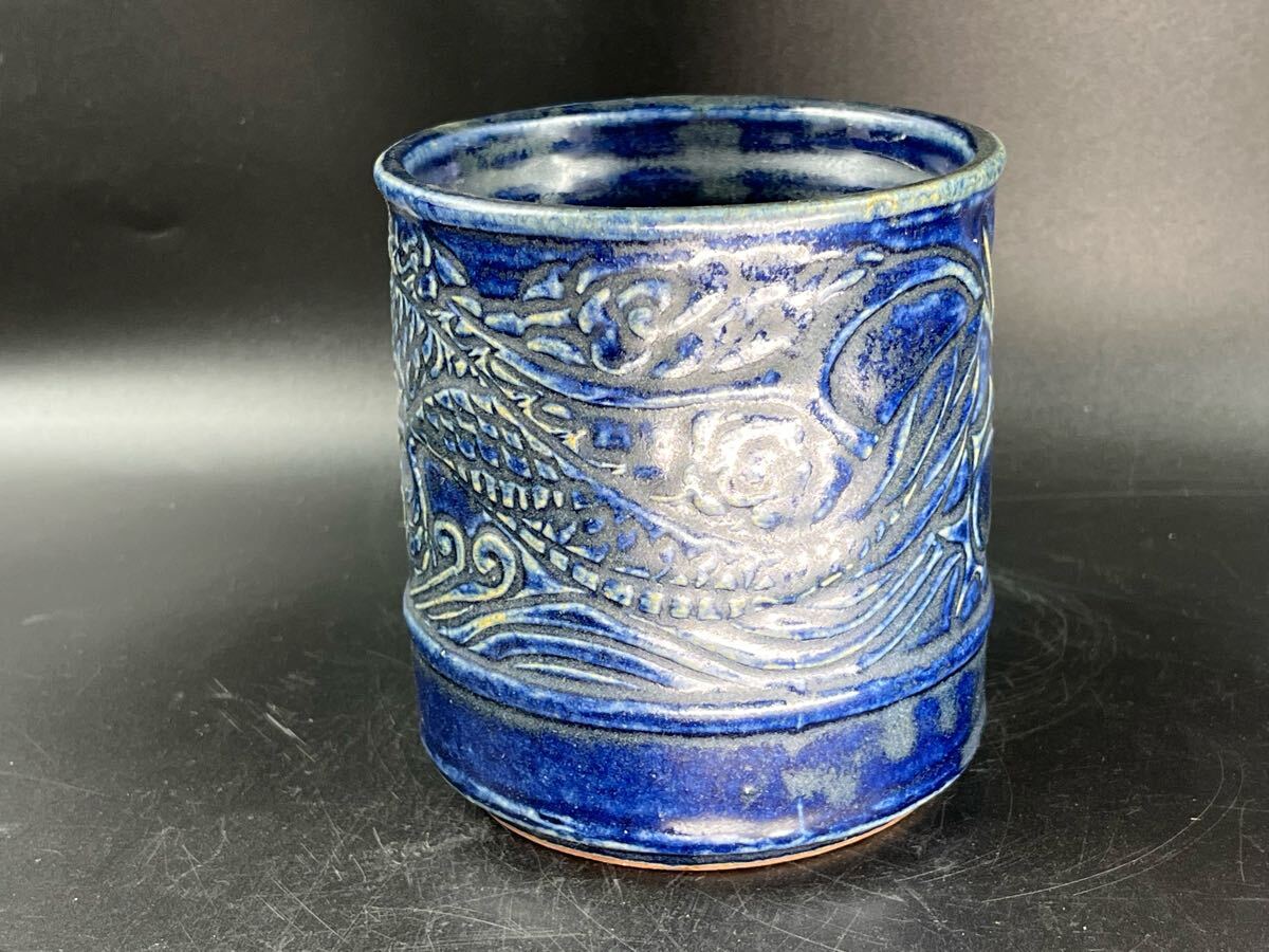 - 中国古玩 筆筒 瑠璃釉 陽刻雲龍紋 清時代 骨董 文道具 書道具【博圓】高11.3cm