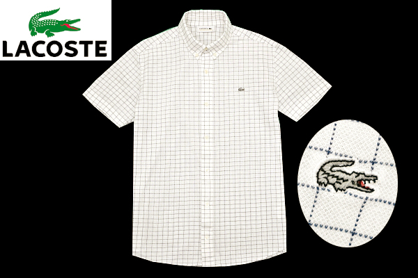 > Y-9820★送料無料★美品★LACOSTE ラコステ★日本製 白 チェック柄 シルバー銀 ワニ刺繍 ボタンダウン 半袖 シャツ 3