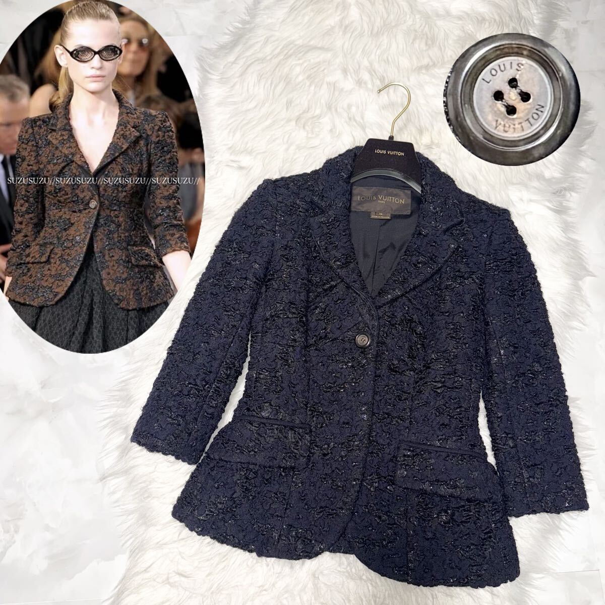 > 本物 ルイヴィトン 1B フラワー ツイード調 切替デザイン テーラード ジャケット 36 ダークネイビー×ラメ入りブラック LOUIS VUITTON