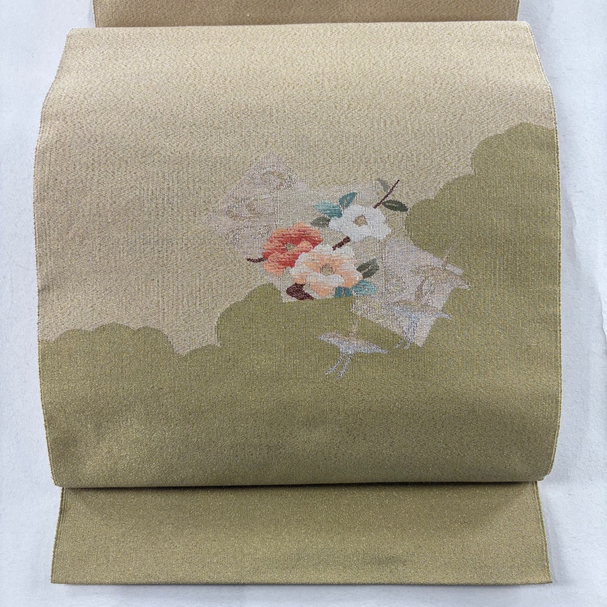 > 名古屋帯 秀品 八寸名古屋帯 松葉仕立て 明綴れ 鶴 金銀糸 金通し ベージュ 正絹 【中古】