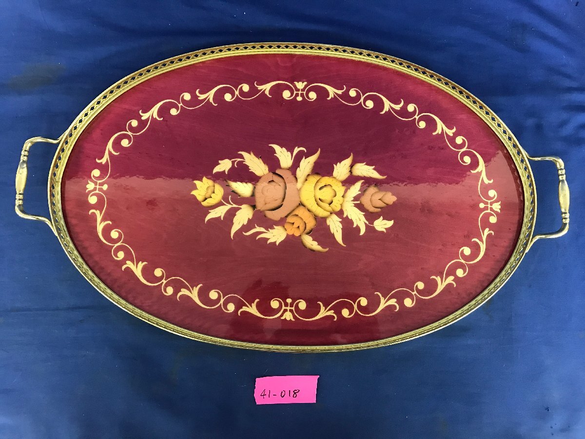 > ★41―018★おぼん イタリア製 金縁 象嵌細工 ティートレイ 茶器トレー 詳細不明 全長約52cm/アンティーク調 楕円 オーバル [100]