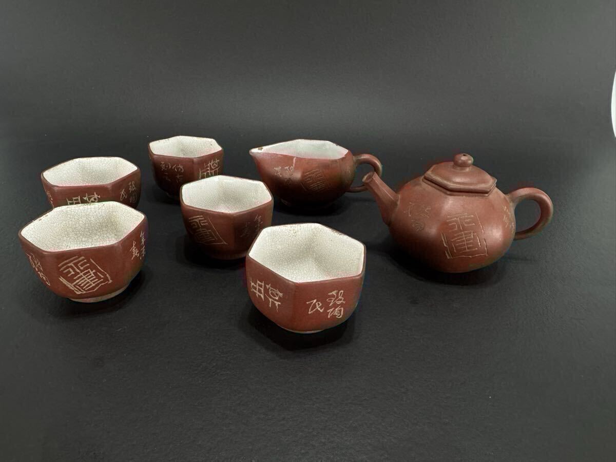 > a0451 呉徳盛製 朱泥 漢詩刻 宣興紫砂 刻印 内白釉 茶器セット 煎茶器揃 煎茶道具 急須 中国 唐物 珍品