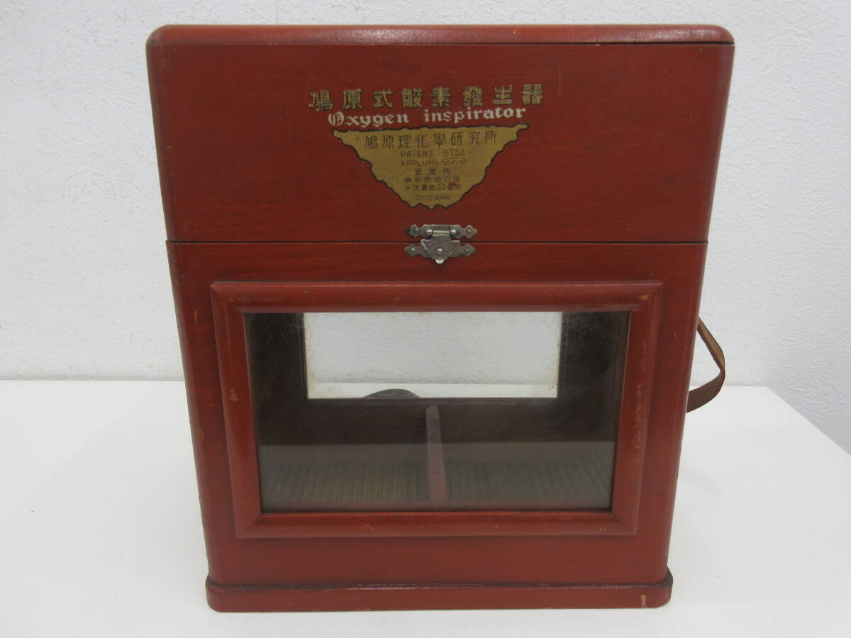 - 鳩原式酸素発生器のガラス入り 木箱 赤色 レトロ アンティーク 多肉植物等観葉植物に