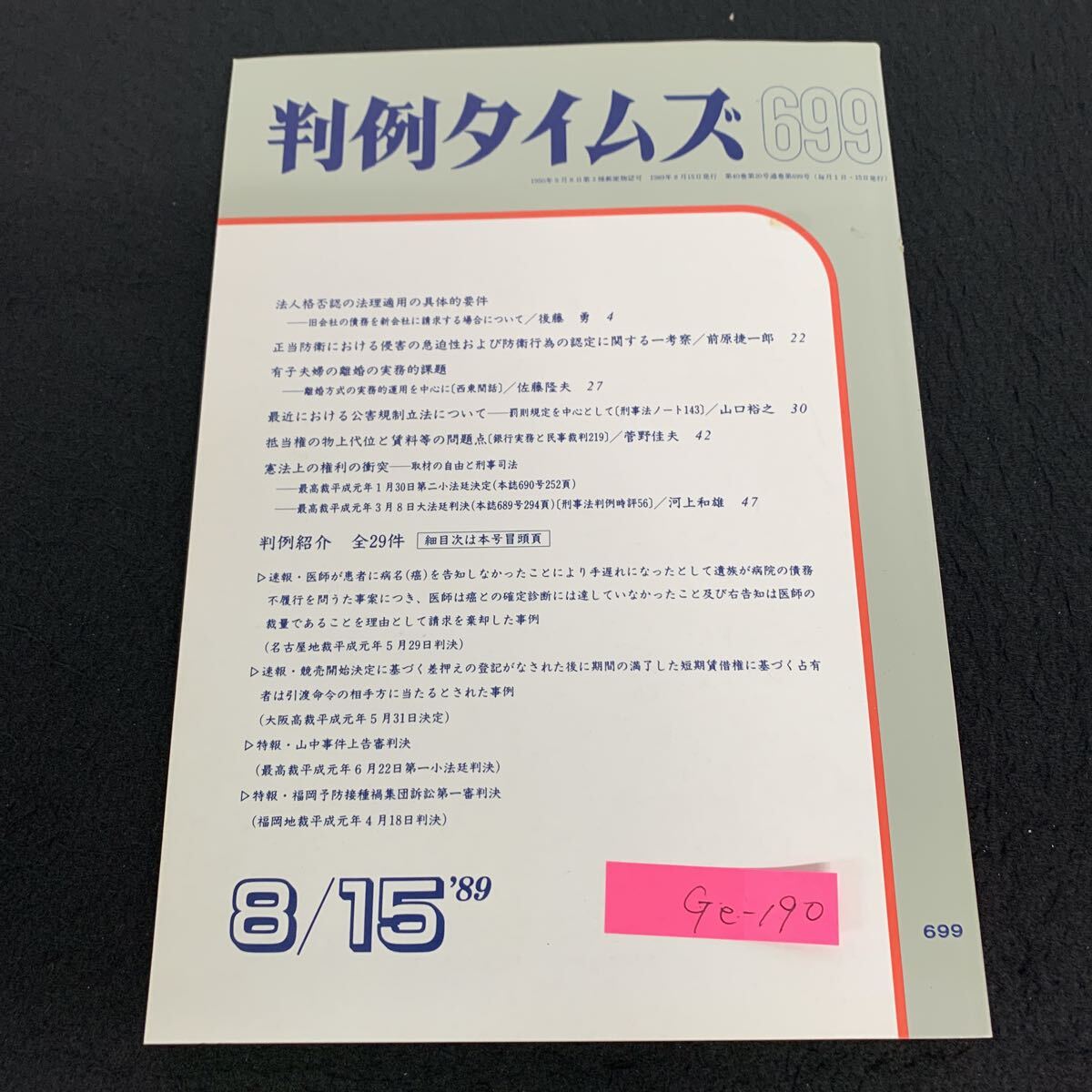 - Ge-190/判例タイムズ699/1989年8月発行/判例タイムズ社/特報/最高裁判例/行政裁判例/労働裁判例/民商事裁判例/刑事裁判例/速報/L10/70922