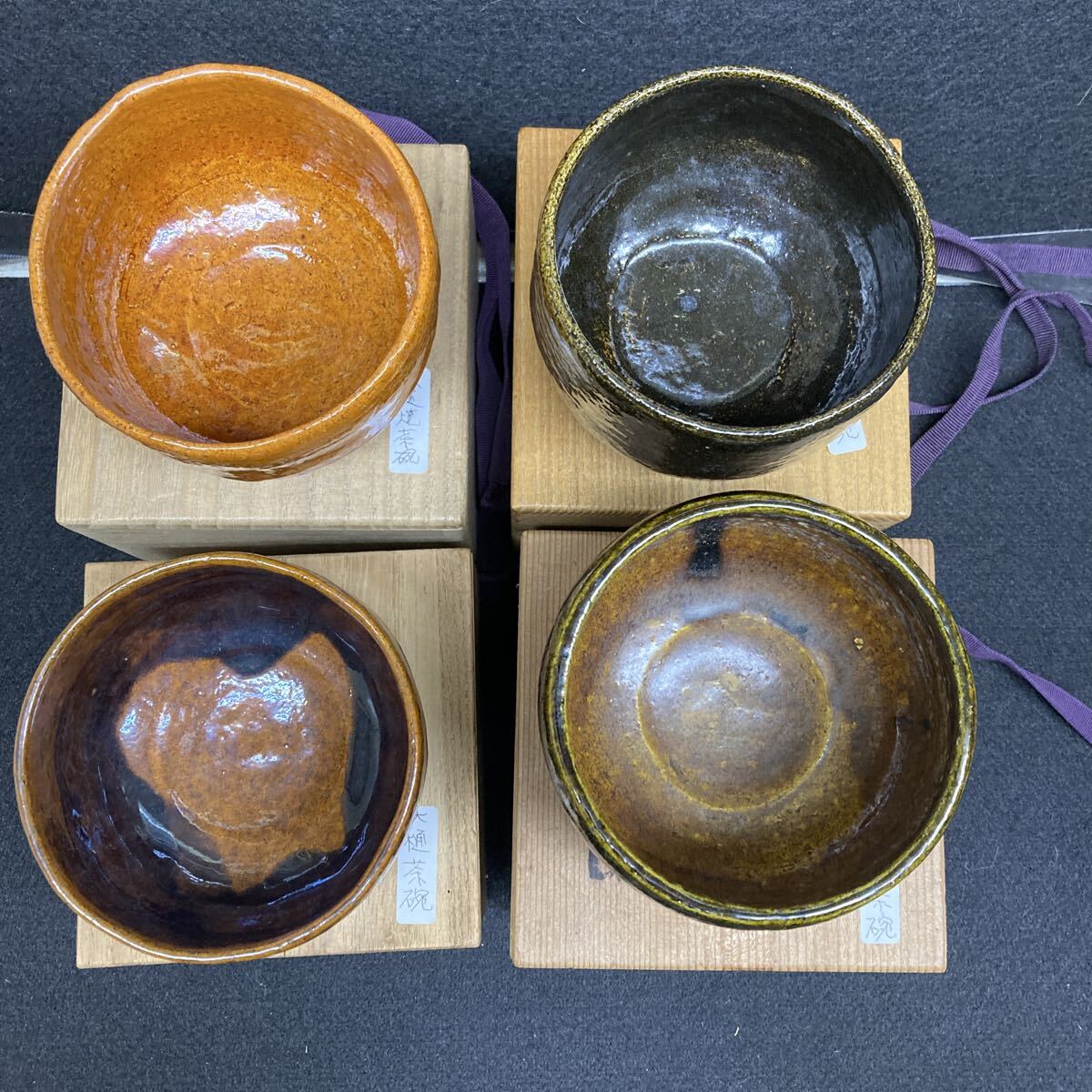 - 九谷焼 大樋抹茶碗 四点組 在銘 陶印有り 作者不詳 合い箱付き アンテーク