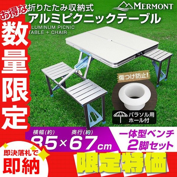 > 【限定セール】新品 アルミテーブル 一体型 チェア セット 軽量 折り畳み パラソル穴付 アウトドア レジャー 花見 ピクニック BBQ mermont