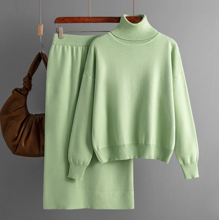 - 343 パンツスーツladiesレディース ◇ ニット素材 カジュアル 上質 防寒 タートルネック グリーン