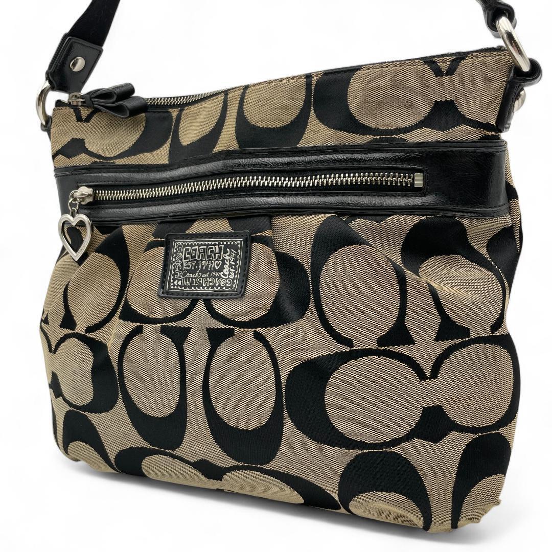 > 良品 COACH ショルダーバッグ キャンバス ブラック ポピー 斜め掛け