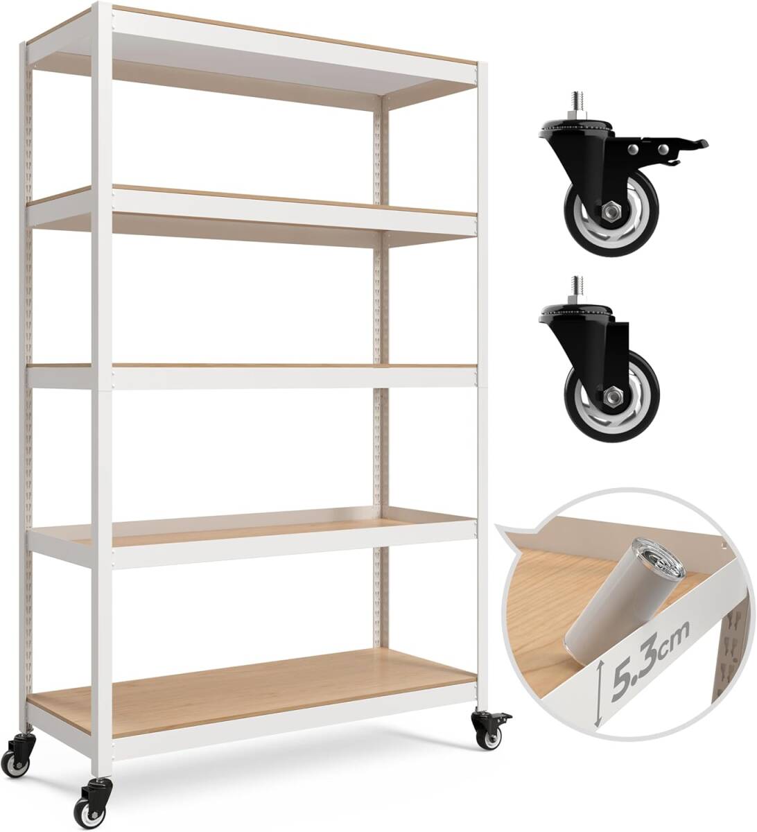 > ホワイト色 キャスター付でお掃除もかんたん 組立簡単 ラミネート スチールラック キッチン 5段 幅120 奥行45 高さ191
