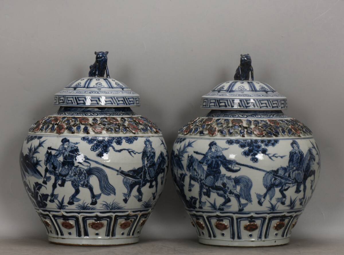 - 元時代 青花釉里紅捏花五虎上將人物故事紋 狗頭蓋罐 一対 極細工・時代物・古賞物・中国古玩・中国古美術