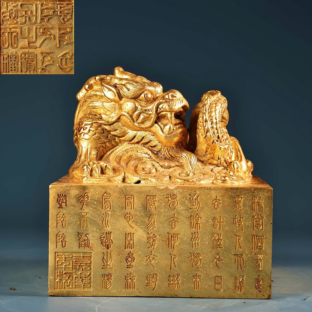 - ◆羽彰・古美術◆Y2631清時代 銅製高浮彫鏨刻塗金龍印章玉璽 細密細工★古置物★古賞物★古擺件★蒐集家放出★唐物